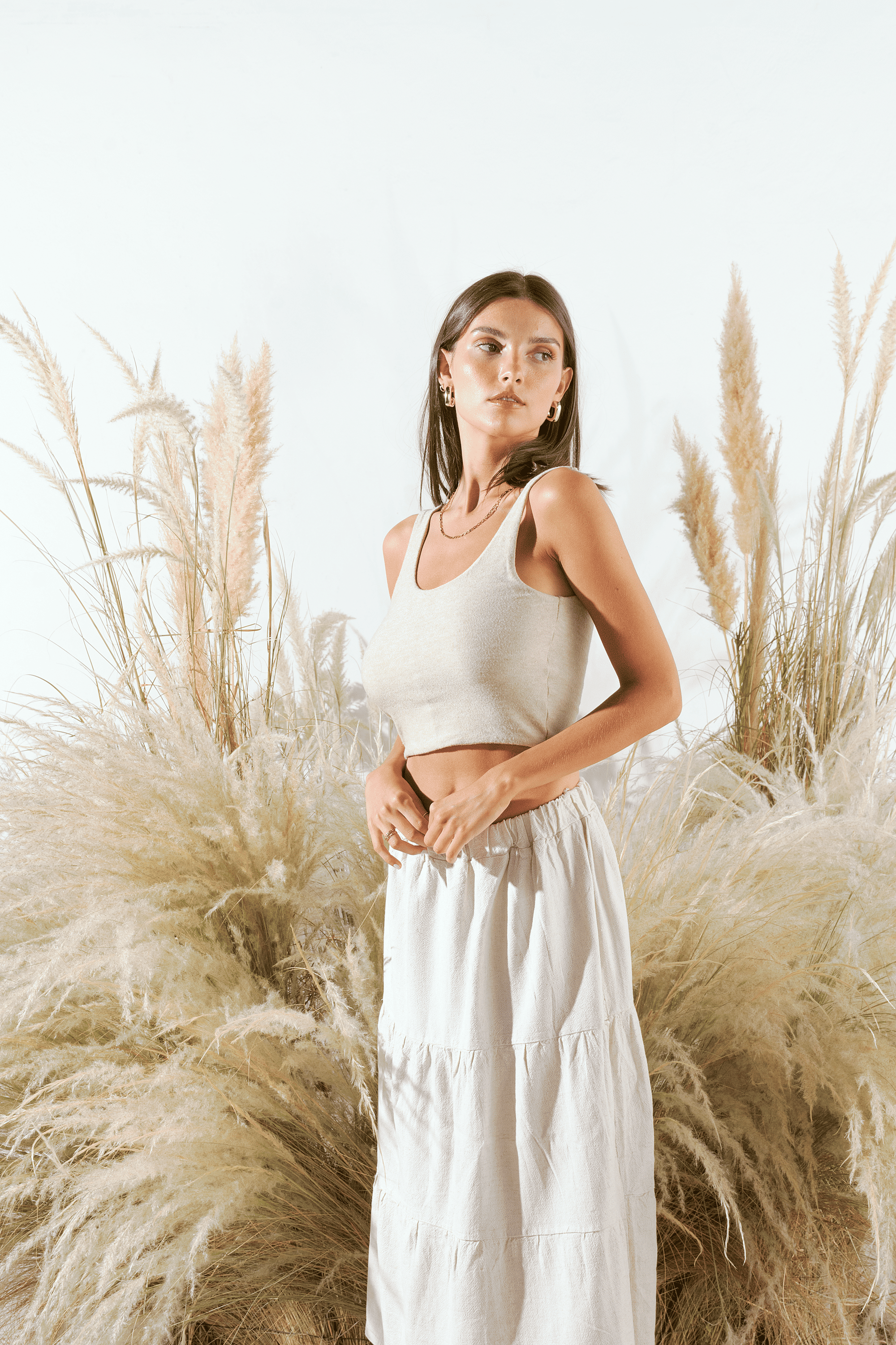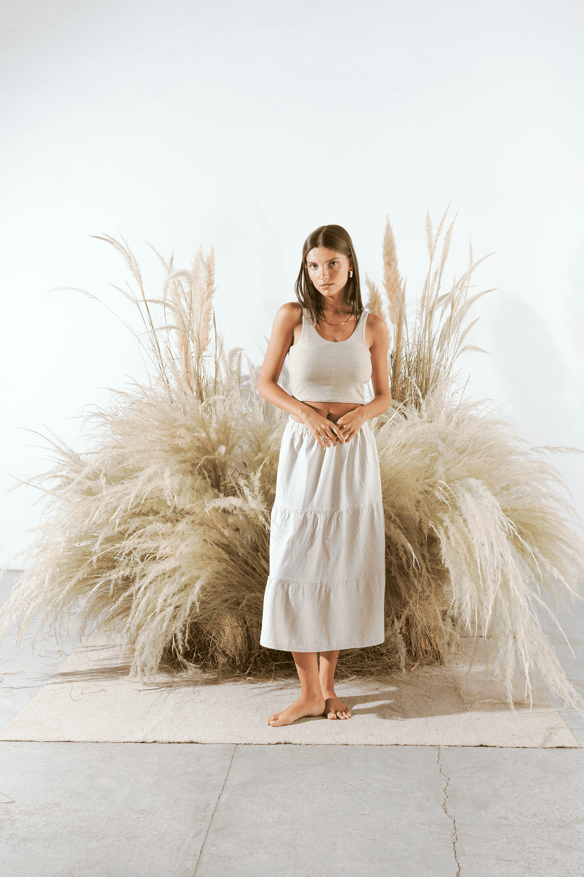 COLORES DISPONIBLES:Falda de lino. Pretina elastizada. Recortes con frunces que generan movimiento. Talle S/M MEDIDAS EN PLANO Contorno de cintura: elastiza hasta 82 cm Contorno de cadera: 110 cm Largo: 75 cm