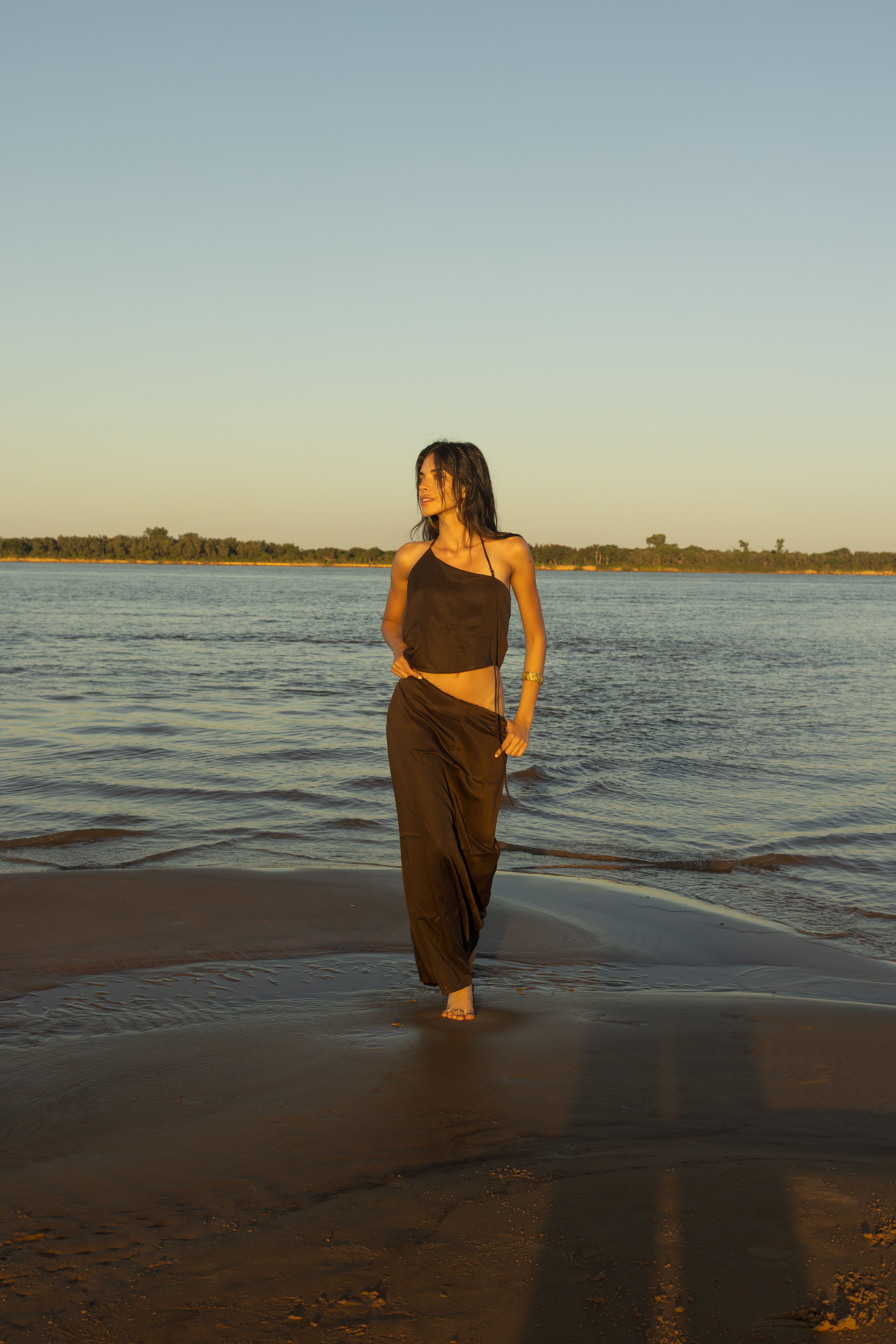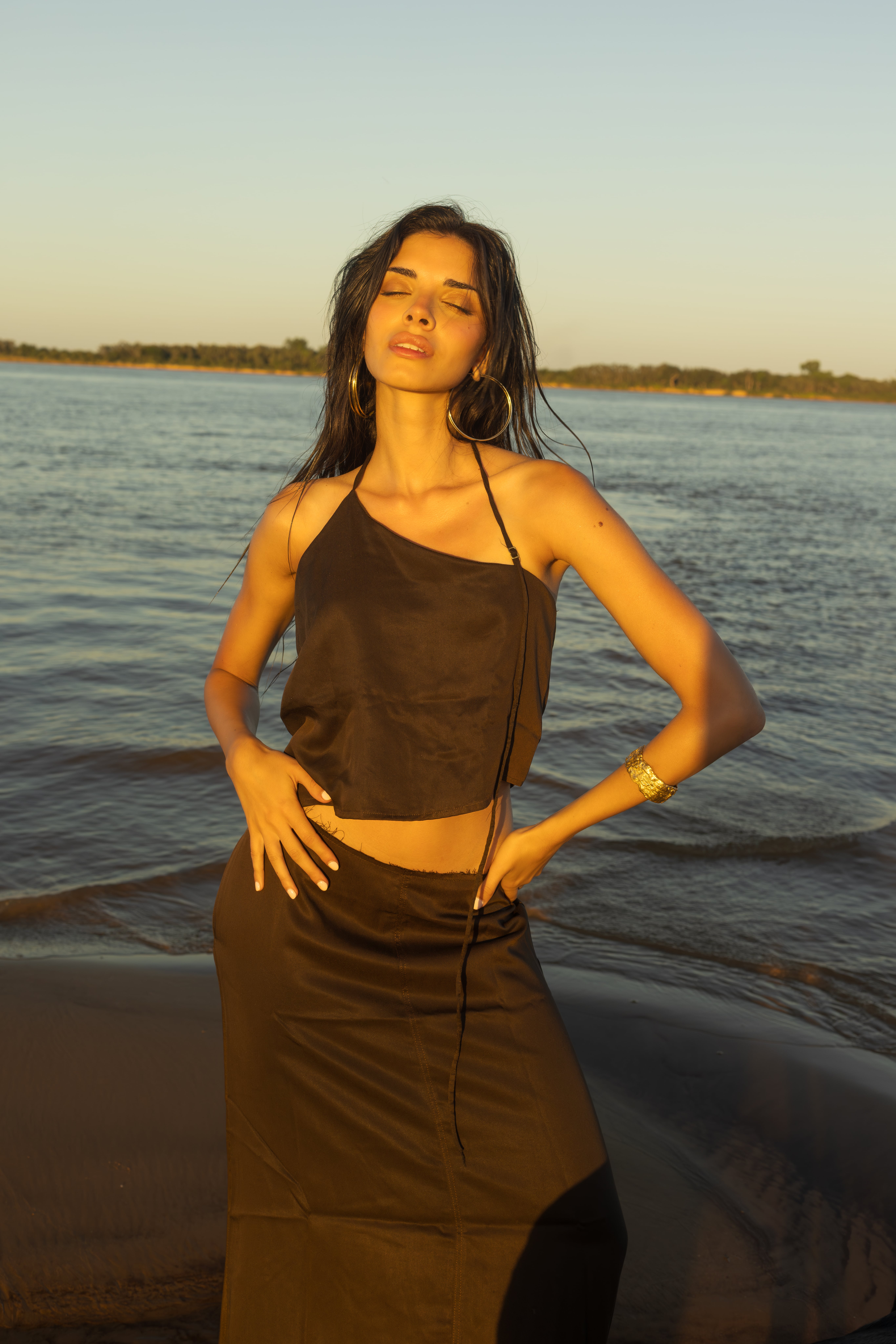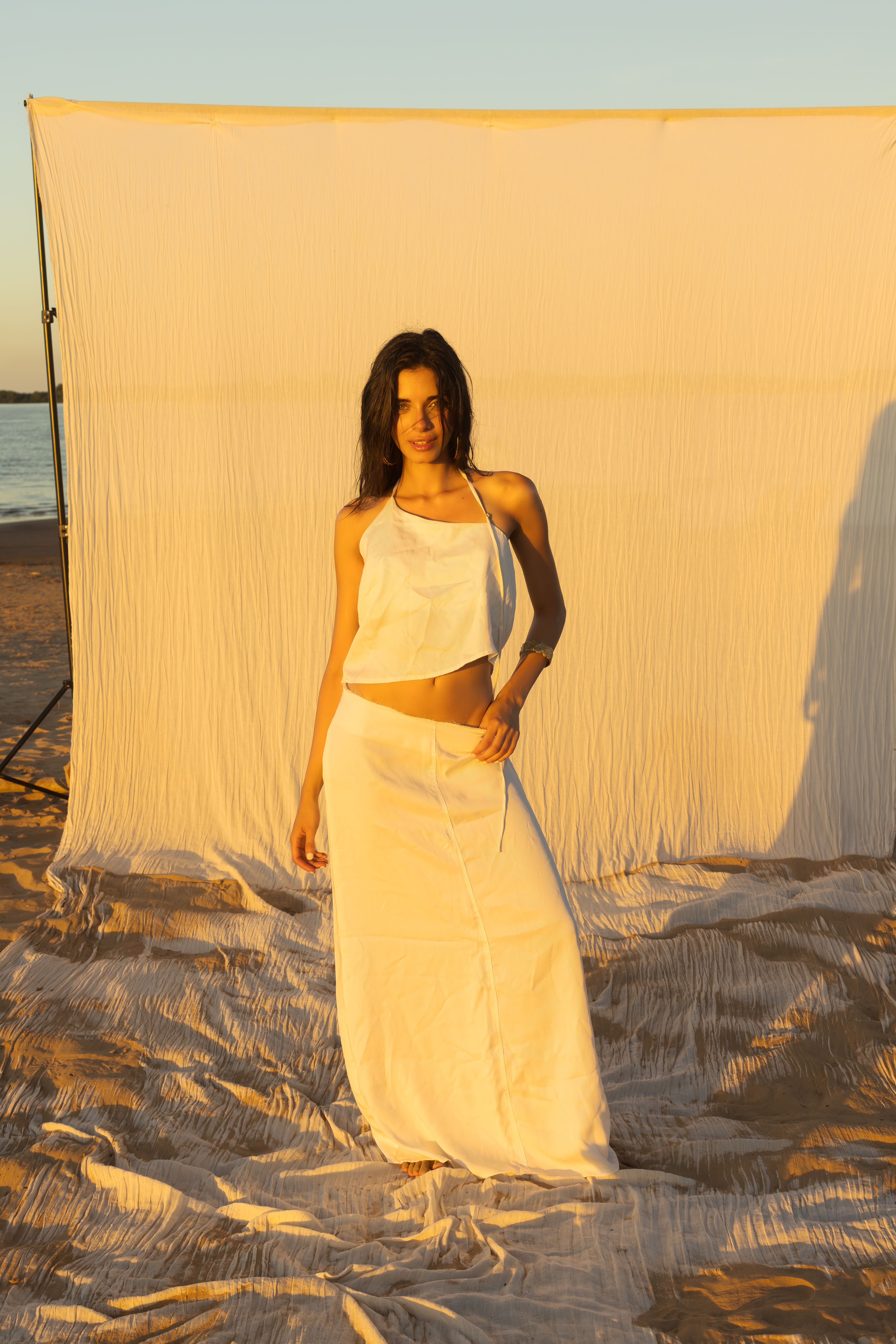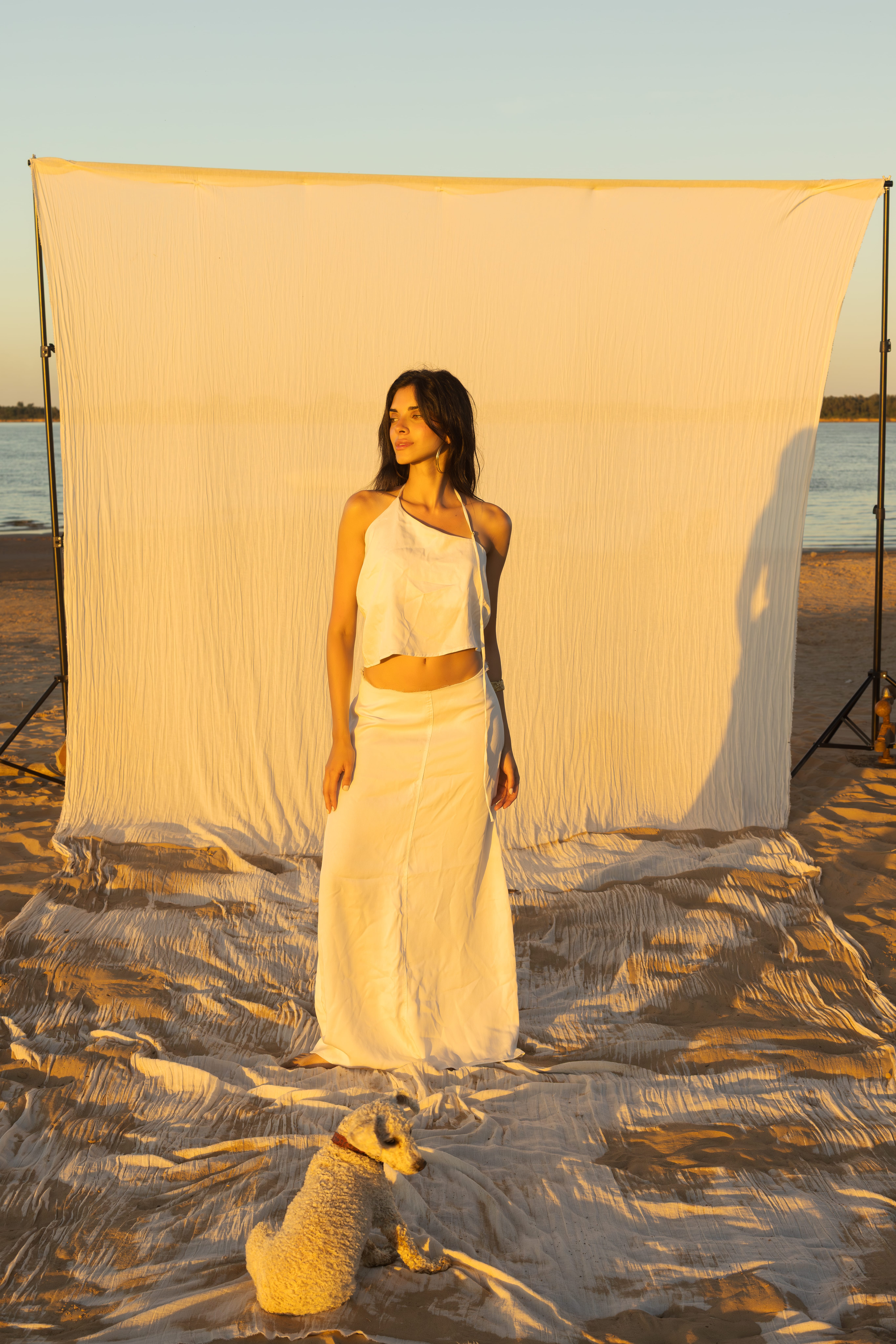 La Pollera Dual combina comodidad y diseño en una silueta fluida que estiliza y acompaña el movimiento. Cuenta con un cierre invisible lateral y una vista interna que garantiza una terminación prolija, sin costuras a la vista, para un uso más cómodo. La cintura presenta una terminación rústica que aporta un detalle diferencial, mientras que los pespuntes a tono recorren el centro del delantero y del trasero para sumar textura y un acabado artesanal. Además, posee dos pinzas en la parte trasera, diseñadas para brindar un mejor ajuste en la zona de la cadera y realzar la forma natural del cuerpo. Si preferís que quede con menos tiro bajo, te recomendamos elegir un talle menos. La modelo usa talle S. Disponible en blanco y marrón. Combinada con la Blusa Dual, forma el set completo, que ya incluye un 10% de descuento aplicado en el precio final. Link del producto en la web: https://deonticshop.com/product/pollera-dual/
