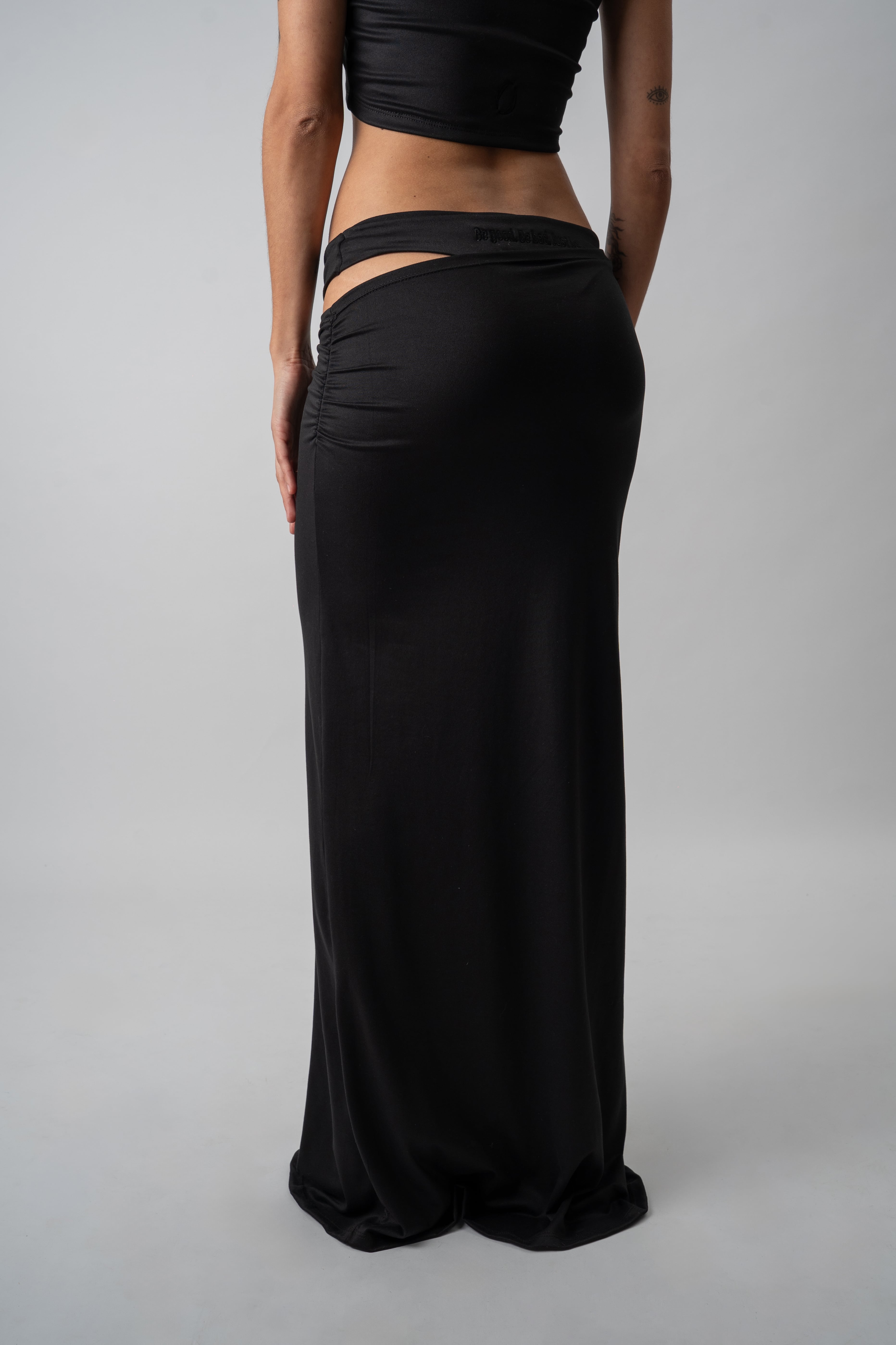 Falda larga confeccionada en modal-soft, con una caída fluida y movimiento natural que acompaña la silueta. Su diseño presenta un frunce lateral que aporta un ajuste y calce favorecedor, permitiendo modificar la altura y decidir cuánto querés dejar a la vista según tu estilo o el momento. El diferencial está en la simulación de ropa interior confeccionada en doble tela, que genera un efecto visual sutil y atractivo, fusionando comodidad con un guiño provocador. En la parte trasera, el bordado “Be good. Be bad. Just be.” a tono funciona como sello distintivo de la prenda. Link del producto en la web: https://deonticshop.com/product/pollera-glimpse/
